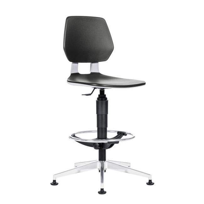 Pracovná stolička s čiernym plastovým sedákom a operadlom, sivým madlom, určená pre laboratóriá, projekčné kancelárie a priemyselné prevádzky.