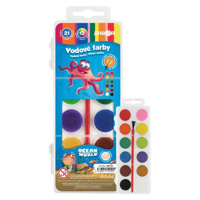 Vodové farby sú určené na maľovanie na papier a iné savé materiály, riediteľné vodou. Tableta obsahuje 12 farieb o priemere 2,1 cm. Súčasťou balenia je i štetec. Rozmer: 8x18 cm. objednávací kód: EC010011, EAN: 8586011524992 |