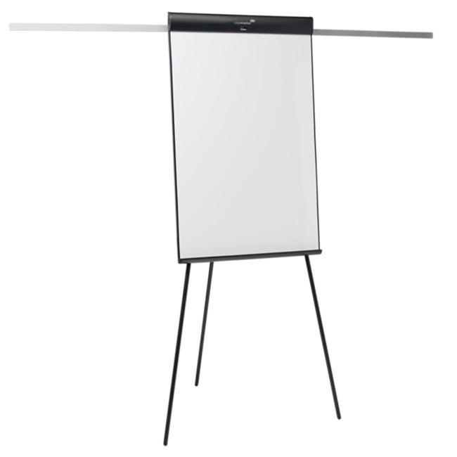 Flipchart s tromi nohami a lakovanou úpravou povrchu. Postranné ramená, vyklápací držiak papierových blokov s variabilným uchytením všetkých štandardných formátov a vyklápacia lišta po celej šírke tabule na odkladanie popisovačov. 2 nohy po bokoch tabule. Tretia noha na chrbte neposúva flipchart pri vyvíjanom tlaku na písanie. Magnetický povrch umožňuje používanie magnetov a popisovanie za sucha stierateľnými popisovačmi. Maximálna výška 187 cm, zastavaná plocha 79×74 cm, rozmery 105×68 cm, hmotnosť 11,5 kg. objednávací kód: LM152900, EAN: 8713797084529 |