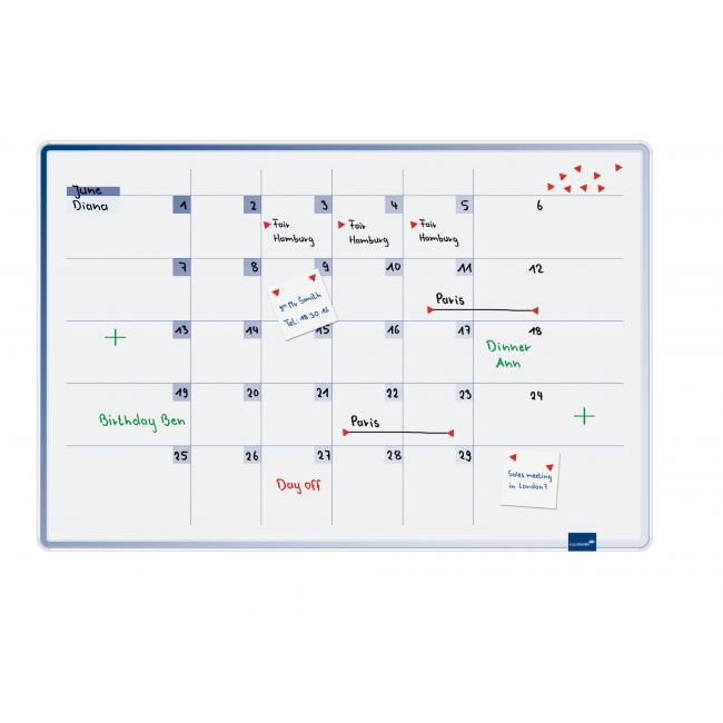 Mesačný plánovač v 6-mesačnom formáte. Keďže názvy mesiacov nie sú predtlačené, plánovanie možno začať ľubovoľným mesiacom. Tabuľa s magnetickým popisovateľným povrchom, grafický rám modrej farby s plastovými rohovými spojkami. Súčasťou je montážna sada, sada stierateľných popisovačov TZ 111 a magnetických symbolov. objednávací kód: LM489500, EAN: 8713797057721 |