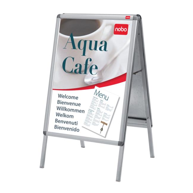Rám na zobrazovanie informácií, plagátov alebo propagačných ponúk do interiéru aj exteriéru. Mechanizmus otvárania na klip, antireflexná fólia z PVC na ochranu pred špinou a prachom, vkusný hliníkový rám s tmavosivými rohovými spojkami. Verzia „A“ so stojanom. Formát A2. Rozmery v × š × h : 850 × 485 × 475 mm. objednávací kód: NB902207, EAN: 5028252194112 |