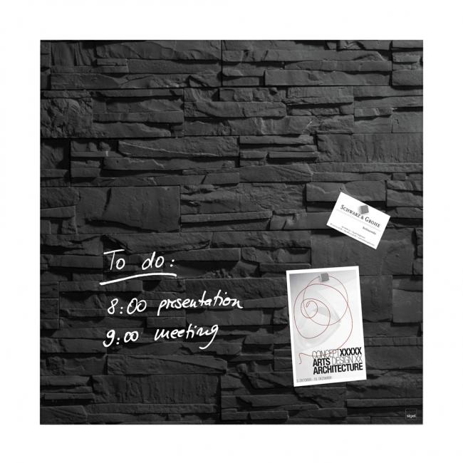 Magnetické tabule z tepelne tvrdeného bezpečnostného skla (EN 12150-1) hrúbky 15 mm s jednoduchou a bezpečnou montážou s certifi kátom TUV dodajú vašim kanceláriám, konferenčným miestnostiam, jedálňam i domácnostiam exkluzívny vzhľad. Sú popisovateľné kriedovými popisovačmi Sigel a za sucha zotierateľné utierkou z mikrovákna. Súčasťou balenia sú 3 super silné neodymové magnety a montážny materiál. Pri používaní príslušenstva Sigel je garantovaná 25-ročná záruka na magnetický sklenený povrch tabule. Rozmery 48 × 48 cm. Dizajn bridlica. objednávací kód: SI000169, EAN: 4004360867132 |