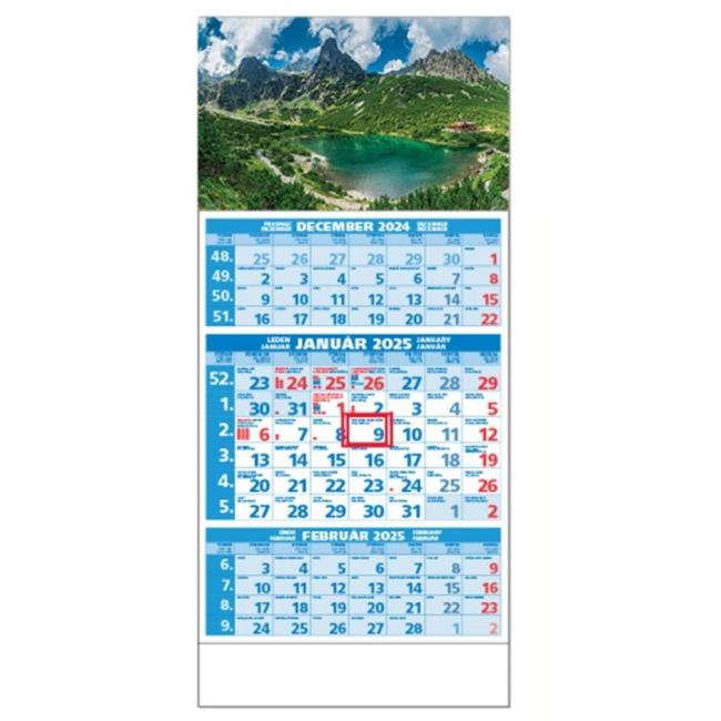 Rozmery: 295 x 663 mm. ROZSAH: 12 listov. KALENDÁRIUM: 3-mesačné s menami SK+CZ názvy mesiacov a dní v SK, CZ, UK, DE, HU. VÄZBA: šitá s perforáciou. REKLAMNÁ POTLAČ: 295 x 60 mm. BALENIE: 50 ks. objednávací kód: T02A, EAN: |
